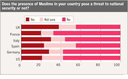 FT: "Only 59 per cent of Britons thought it possible to be both a Muslim and a citizen of their country, a smaller proportion than in France, Germany, Spain, Italy or the US - the other countries polled by Harris Interactive."