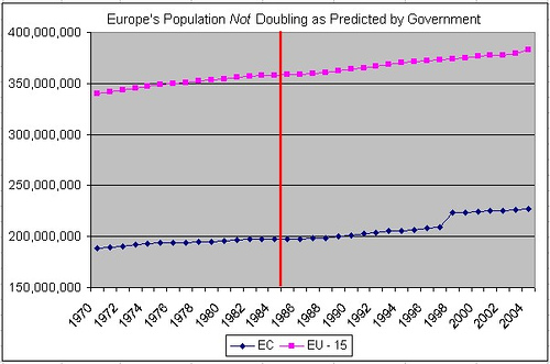 The red-line denotes 1985. Europe’s population did not double between 1970 and 1985. It has not even doubled between 1970 and 2004. (The sudden jump in the blue line is due to the fact that the population of the former German “Democratic” Republic was added to that of [West] Germany.)